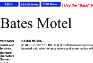 On August 19, 2008, Bates Motel was registered as a trademark for use in “Entertainment services in the nature of an annual Halloween event featuring a haunted hayride, a haunted house, a haunted corn maze, a haunted trail, which employ actors and scare tactics with the intention of entertaining customers, by Agritainment Incorporated.