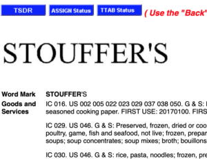 STOUFFER’S – Stouffer’s® is registered for use of “Baking paper & paper sheets for cooking, Preserved, frozen, dried, or cooked vegetables, potatoes, fruits, mushrooms, meats, fish, and soups. Rice, pasta, noodles, and sauces.”